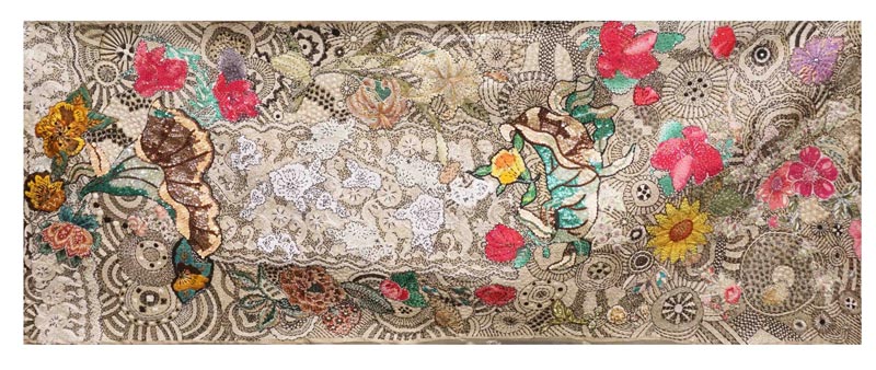 Banner: Abaca material with organza backing, upcycled hand embroidery art work, 30 x 137 inches