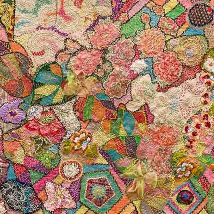 Unsatisfied with mere patchwork, she guided her atelier in the application of various surface decoration. Beadwork and obsessive stitching introduced texture on an otherwise flat surface. They also layered new forms over the existing patterns.