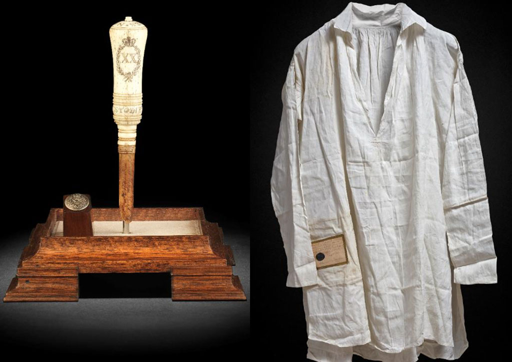 From left: A bone apple corer, carved on St. Helena by a member of the 20th Foot; Napoleon’s shirt worn on St Helena, circa 1820
