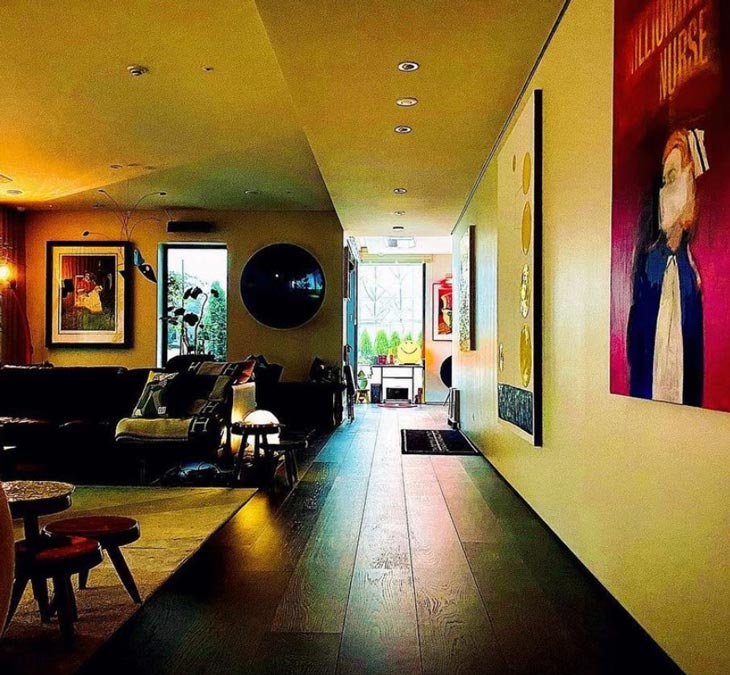 The home’s hallways display larger artworks like the 2018 Ricardo Passaporte acrylic painting called Exciting Love, a 2016 Untitled oil and enamel painting by Rudolf Stingel, a 2015 painted stone statue named Green Yellow Orange Red Pink Mountain by Ugo Rondinone, and the 1970 Ultrafragola mirror by Ettora Sottsass in white fiberglass but turns pink when illuminated.