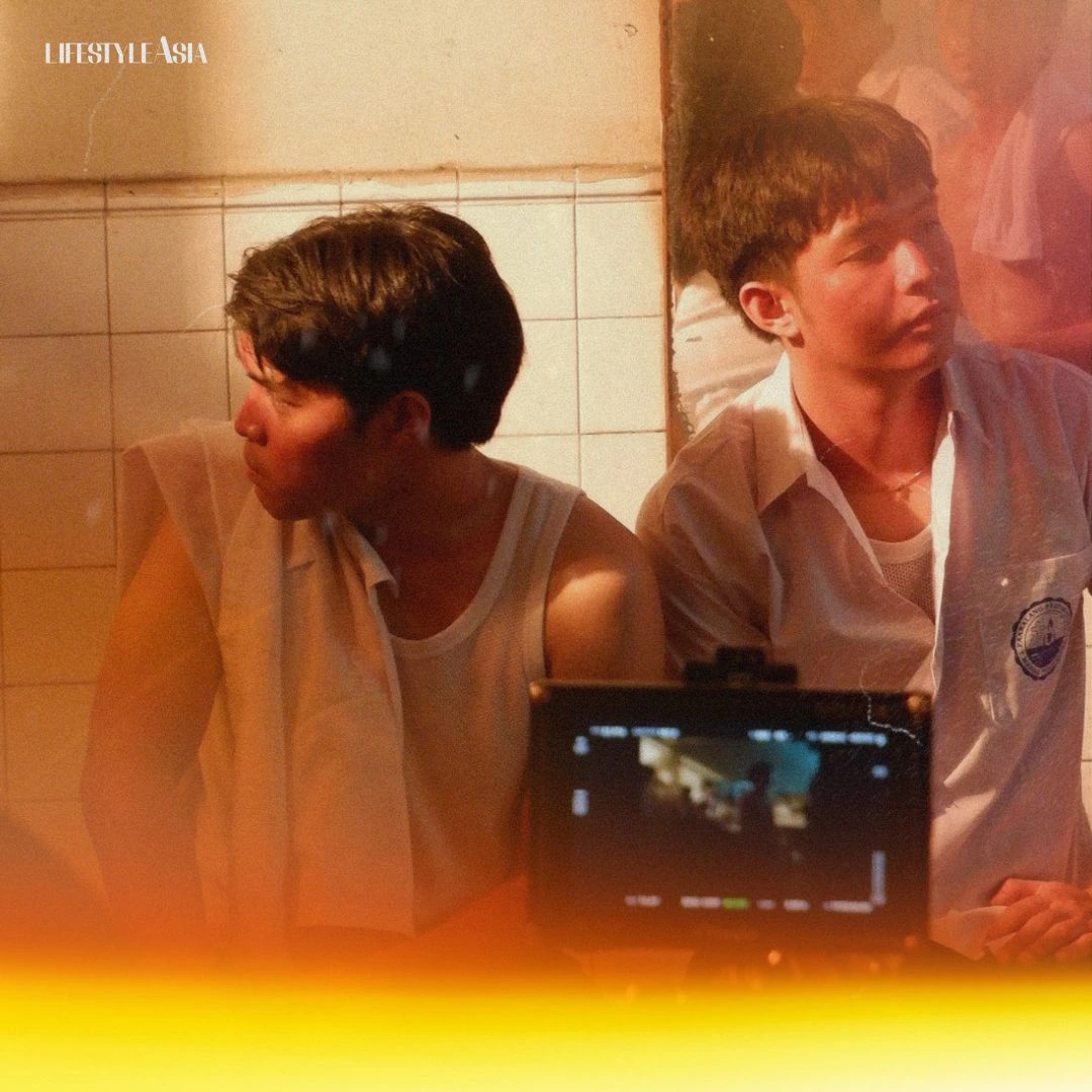 Makeup artist Ada Bernaldo shares that the mood board was already defined from the start, with one of the primary inspirations being Chinese model Ye Hao’s GQ China “Heatstroke” editorial. But what works in a still photo doesn’t always translate seamlessly into motion. “To match it [the inspiration] with the film, we had to make it look more realistic. Dry lips, blemishes, and messy hair were the key elements of the look. It’s important to note that we had to do the entire body makeup on nine boys, for multiple shooting days,” she explains. Continuity became just as crucial as creativity. “No shifting tan lines allowed,” Ada adds.