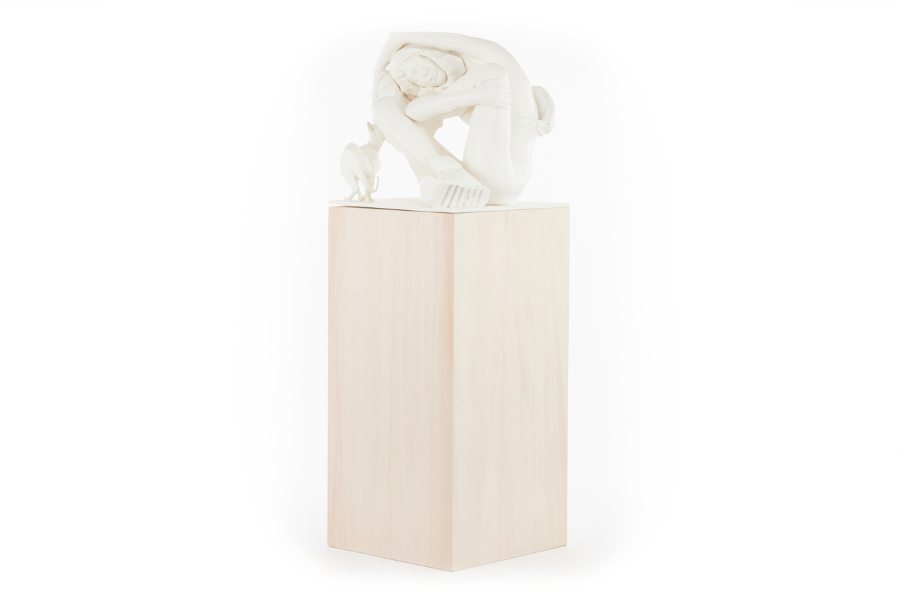 Paris-based artist and photographer Valentin Herfray uses his box to stand a 3D printed sculpture of Sophie Koella. His muse, a model and artist, is seen in an entangled position with a cat and wearing LV’s Pillow Comfort Ankle Boots.