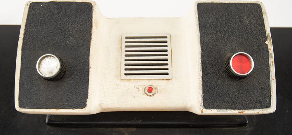 The system mock-up has two potentiometer paddle control knobs, a red “start game” push button, a central metal grill for a built-in speaker.