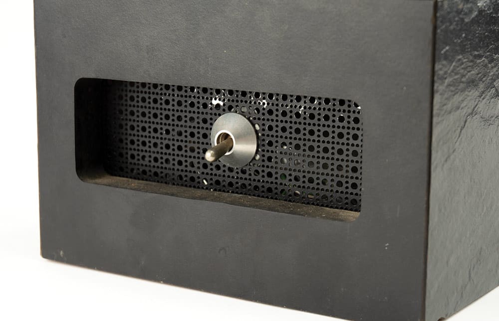 The box, which has the electronics concealed inside, is powered by an AC adapter and has an on/off toggle switch on one side.