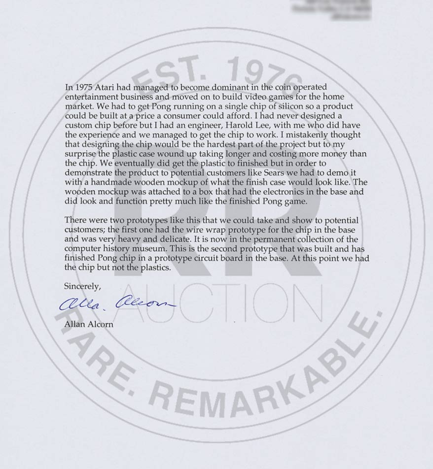 In the provenance letter, Alcorn recounts the challenges in making Pong accessible to the public.