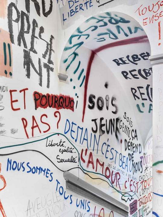 Pre-Fall 2018’s homage to the Parisian youth of ‘May 68’ on the 50th anniversary is evoked by a graffitied stairway that connects the two floors of the space. For Spring Summer 2018, interdisciplinary artist IgnasiMonreal created in almost 900 hours of painstaking work, a giant hand-painted mural that covers the walls and ceiling.