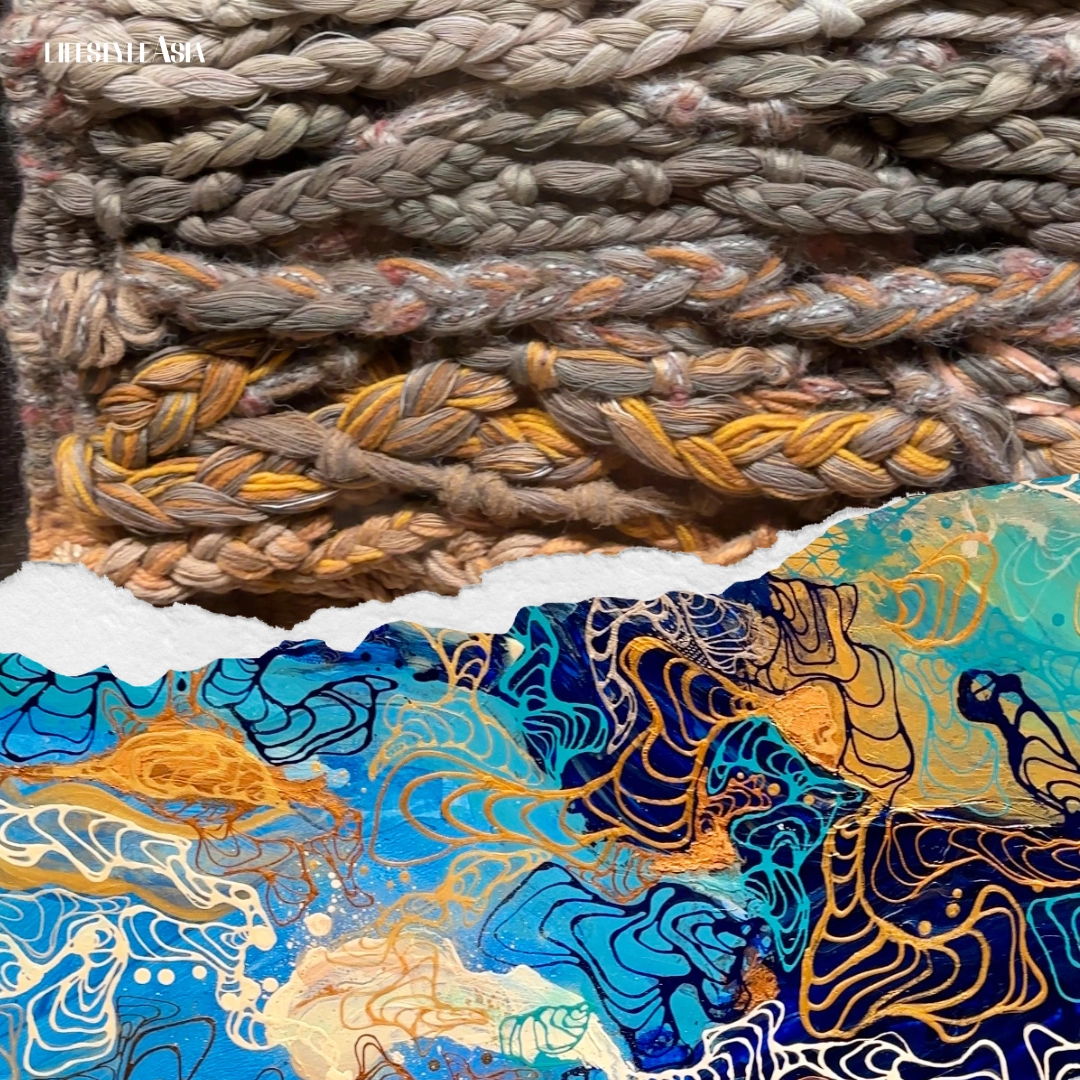 The way one might enjoy a finely-woven tapestry, you begin appreciating the works at a distance, seeing the bigger and more cohesive picture. But you only start to understand the striking nuances as you step closer—smaller elements like the swirling evanescence of mother of pearl, wisps of thread-like paint, and fibers in swathes of yarn lending a sense of fullness to each piece.