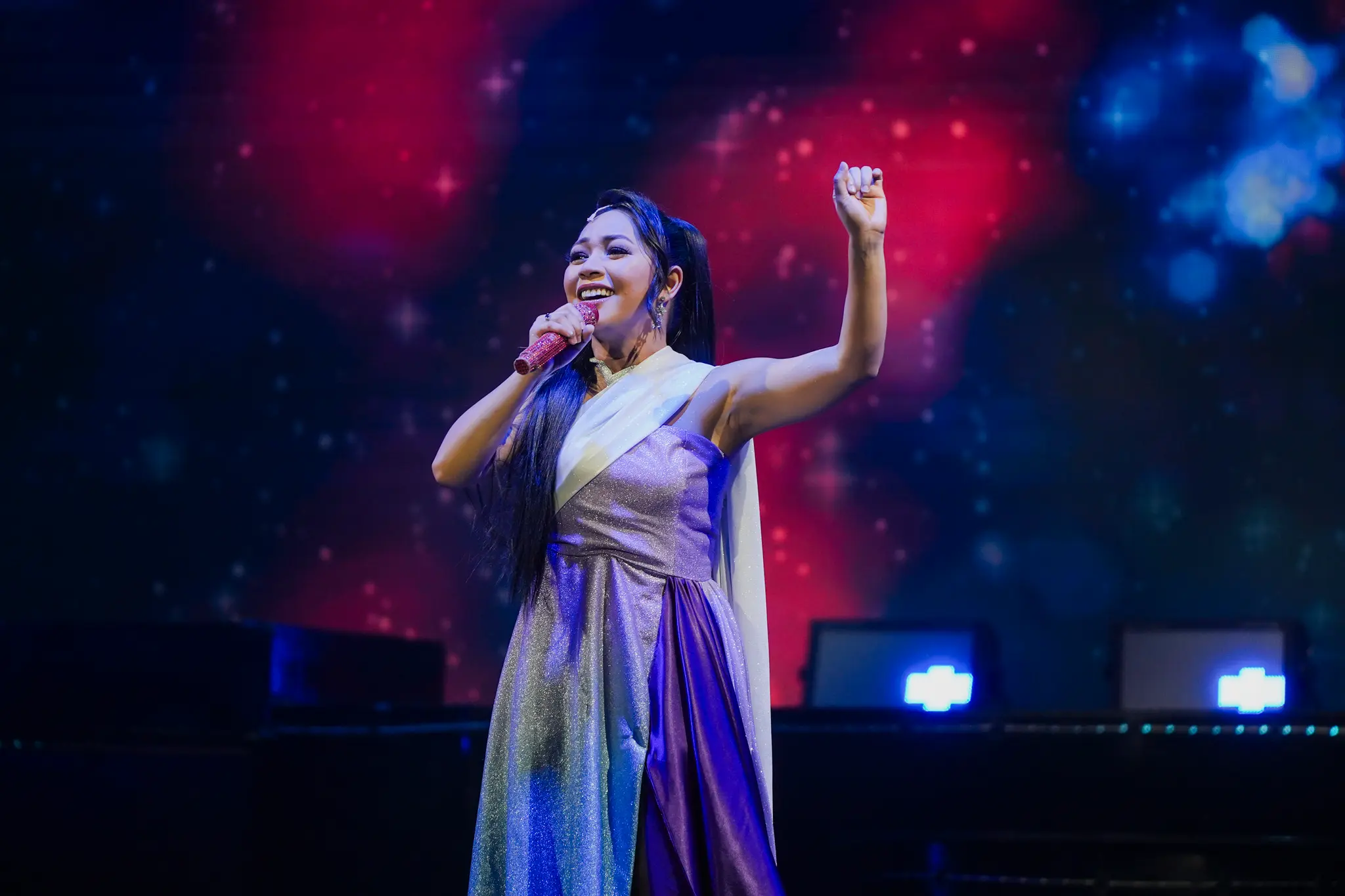 The supporting cast of Idols of the Galaxy contestants deserve an applause as well, helping carry the show with stellar singing and utter dedication to their roles as they mirror the exaggerated stereotypes of entertainment. I’m talking about the resident conyo mean girl Phoebe (Chaye Mogg); the maldita but undeniably talented judge Miss Mamon (Tex Ordoñez-de Leon); heartthrob and love interest Raymond (Omar Uddin); the hilariously clingy lovebirds Billy and Sheryn (Alfritz Blanche and Natasha Cabrera); and the anxious-but-secretly-talented nerd Kiki (Shaira Opsimar), who later becomes Delia’s best friend. Speaking of Kiki, Opsimar kept delivering one spectacular performance after another; for a moment, it seemed like audiences forgot they were watching a musical about a singing competition, claps and hoots echoing across the theater and tailing her impressive belting.