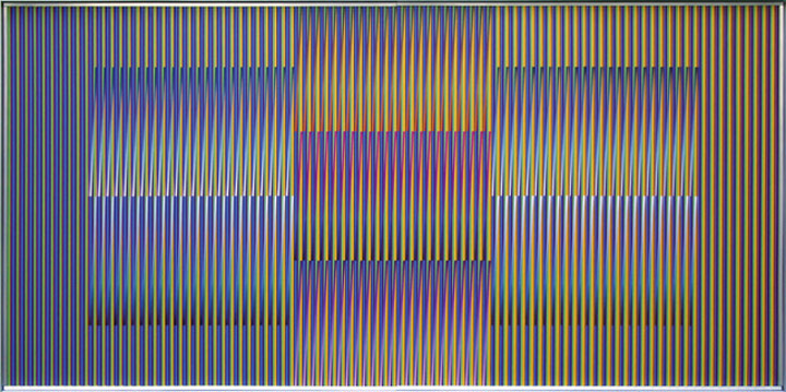 Cruz-Diez’s series Physichromie, whose name is a portmanteau of “physical chromatism,” encapsulates extreme abstraction: strips of red, green, and white cardboard inserted in a frame, sometimes forming geometric shapes with no traces of a recognizable subject. His works are generally based on the moiré effect, in which lines of contrasting color give the impression of movement.