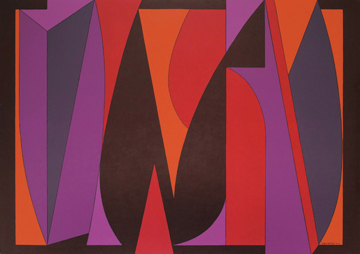 Recognized for his gestural, minimalist hard-edged, and color field paintings, Aguinaldo (1933-2007) revitalized abstraction in the local setting. An untitled artwork from the 70s (45” x 54”, aqua-tec (acrylic) on marine plywood, signed and dated 1978 verso) shows his penchant for hard-edged, glass-surface acrylic series.