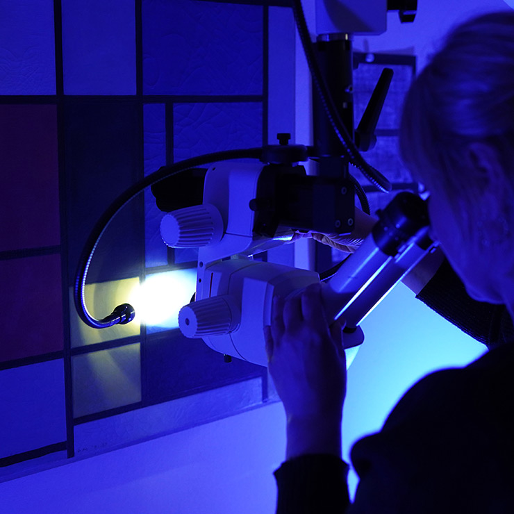 In-depth examination, scientific study, assessment of condition and predicting the impact of time and change on these four Mondrian paintings is achieved through technology-based methods such as X-radiography, infrared reflectography, material analyses and high magnification.