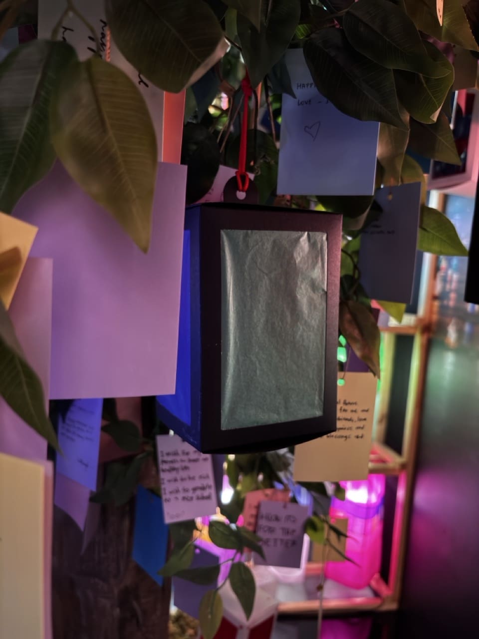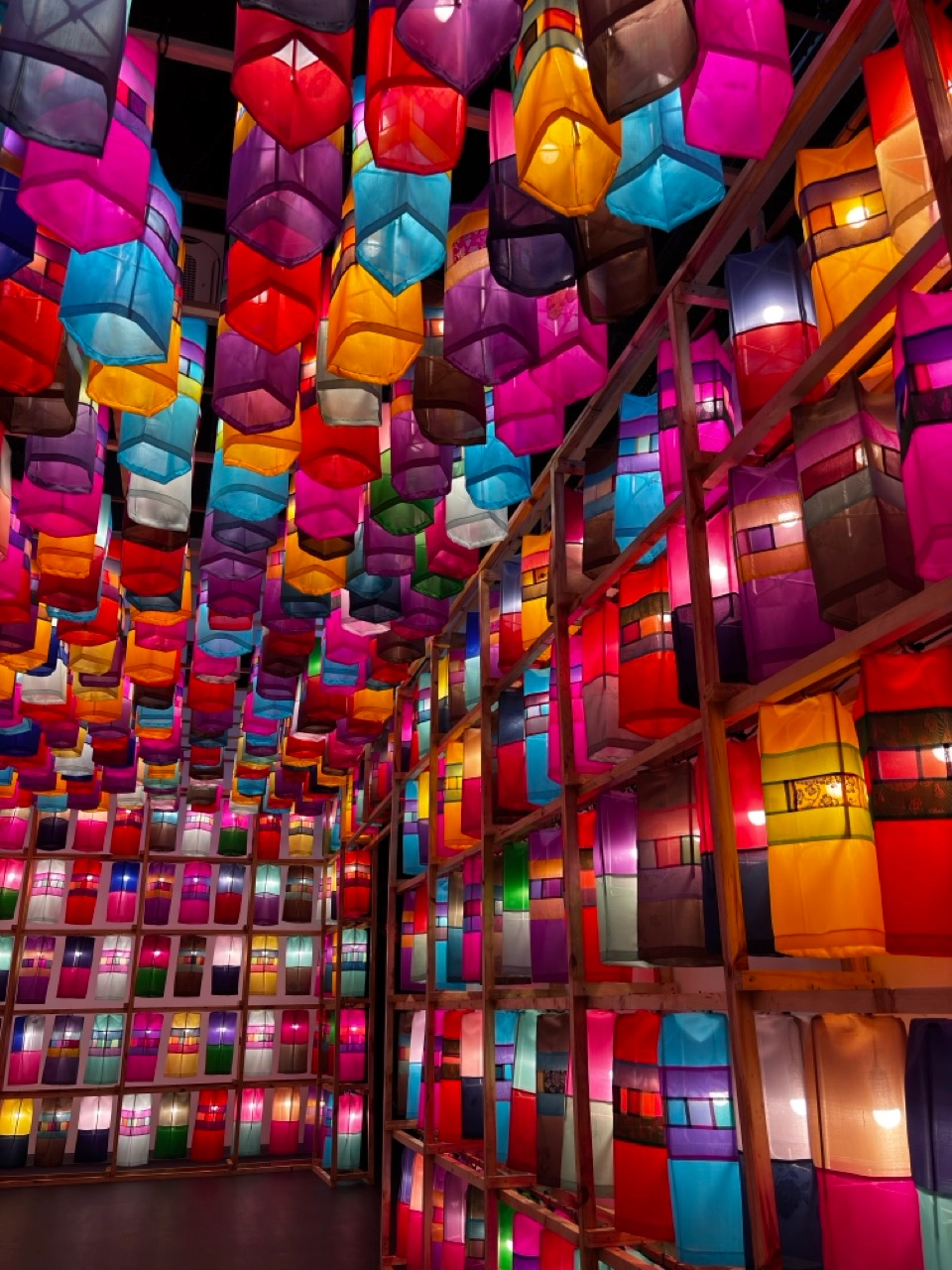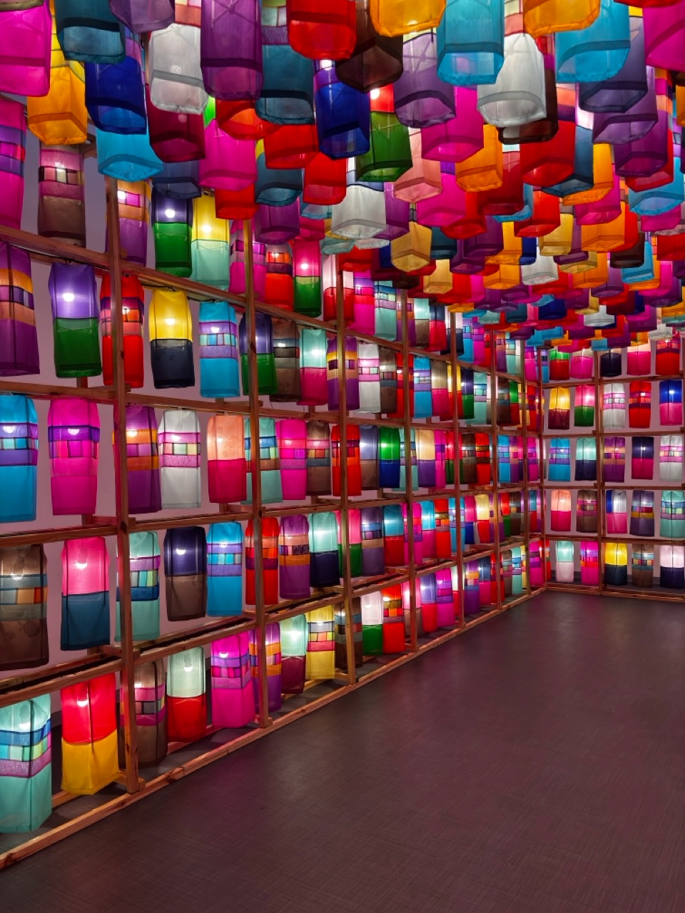 Entering the exhibition, one is greeted by a small Wishing Tree covered in papers containing the well-wishes of guests who’ve come to visit. It’s as much a part of the exhibit as the lanterns, which cover more than half of the space: colorful pieces that emit a hazy, yellow glow, transporting you elsewhere.