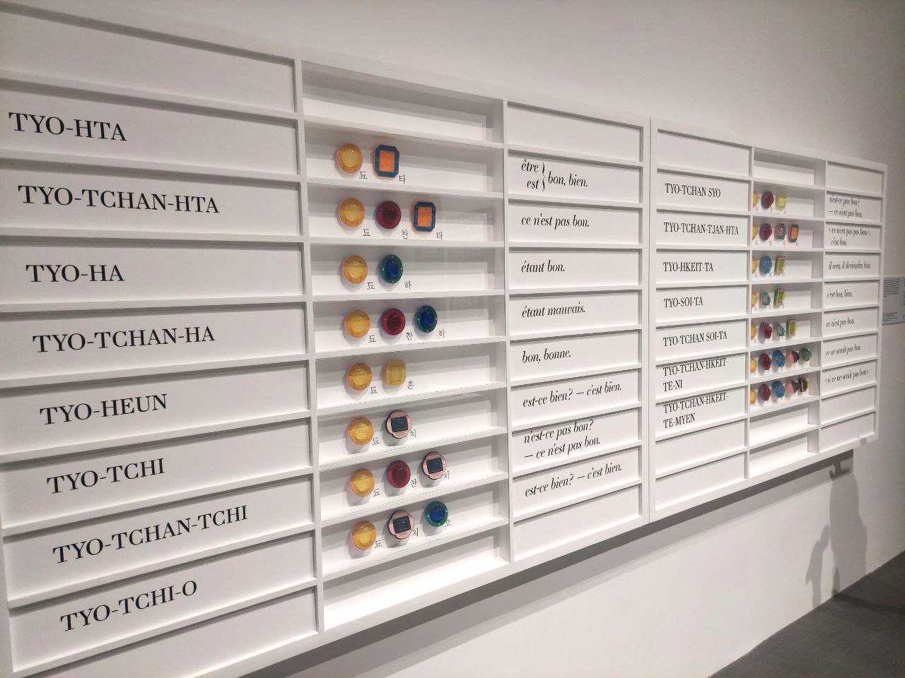 Here, Hangeul is a window to a new world through works such as the glass panel diptych “한HAN글文” by Hwa-young Lee, which portrays Hangeul’s evolving nature; “도챤쇼” (TYO-TCHAN-SYO) by Lee Seul-ki, which uses various ornaments to recreate words from a French book on Korean grammar (Grammaire Coréenne by Félix Clair Ridel); “ME뉴판” (MENewpan) by Yoo Hyun-sun, which reconfigures beloved Korean food names in a street art-style menu format; and “Unfamiliarity, Newness and Fusion” by Lee Chung-Chung, which integrates text from Han-eo Munjeon into clothing pieces, just to name a few.