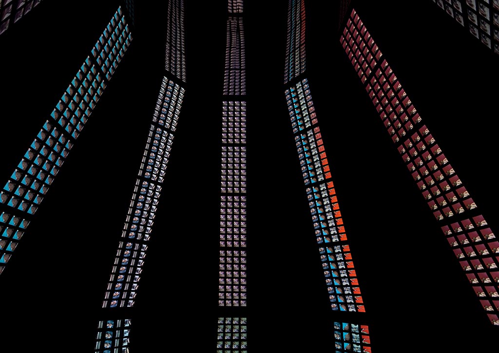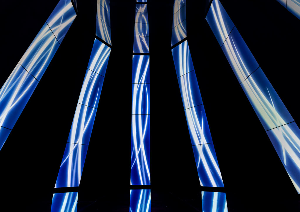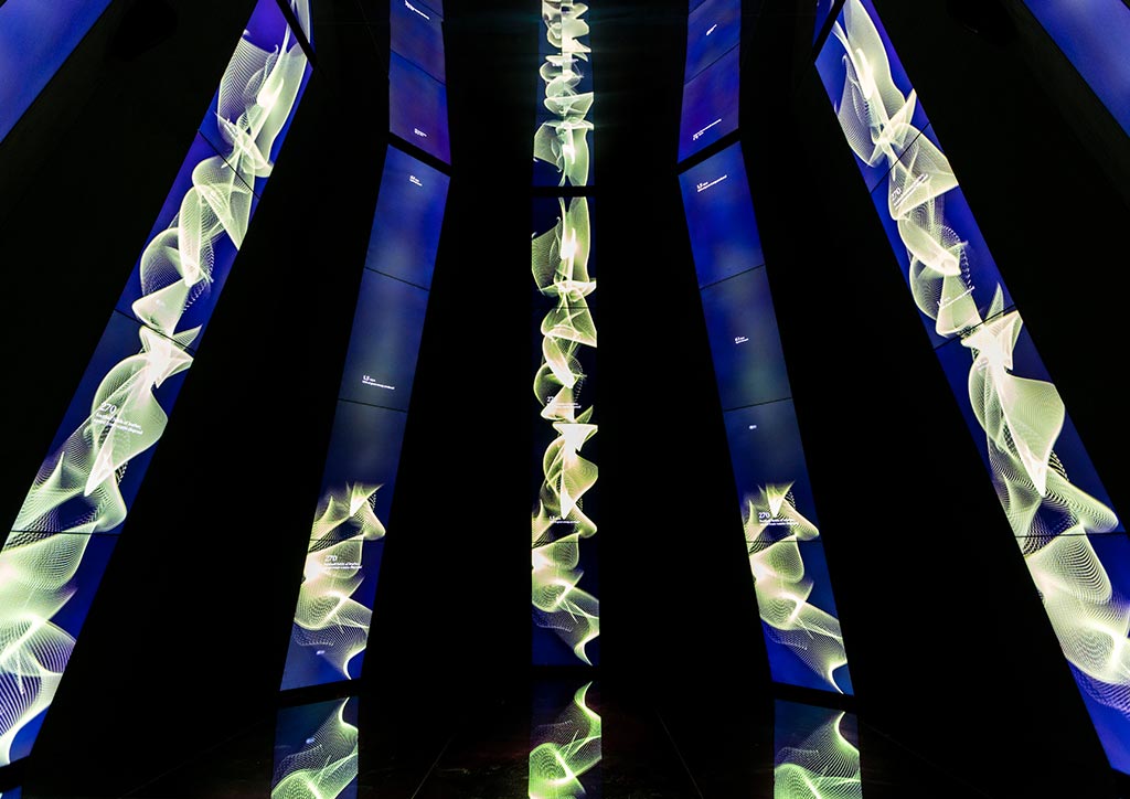 The installation’s heart is accessed through a dark corridor, in which a play of lights leads to the central hall, covered with reflective soundproofed surfaces, punctuated by a full-height vertical LED screens.