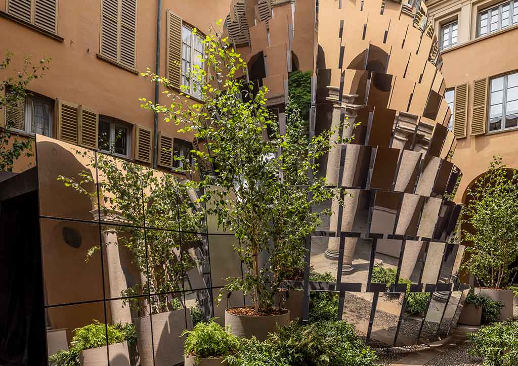 Full of plants and covered with large, mirrored tiles, the immersive space evokes natural elements as they dematerialize, radiating into ether. The courtyard of the 18th-century Palazzo Gallarati Scotti becomes a new place of interaction for the Milanese public during FuoriSalone 2022.
