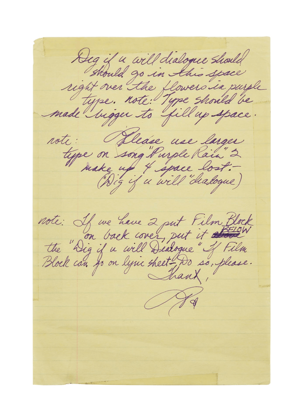 Prince guitar historian John Woodland comments: “Out of all six guitars Sadowsky made for Prince, the purple floral one saw the most use […]” The guitar may fetch an estimated $200,000 to $400,000. The musician’s signed handwritten notes related to the Purple Rain back cover album text will also be up for auction, and may fetch around $8,000 to $12,000.
