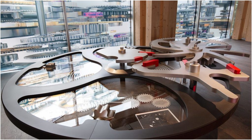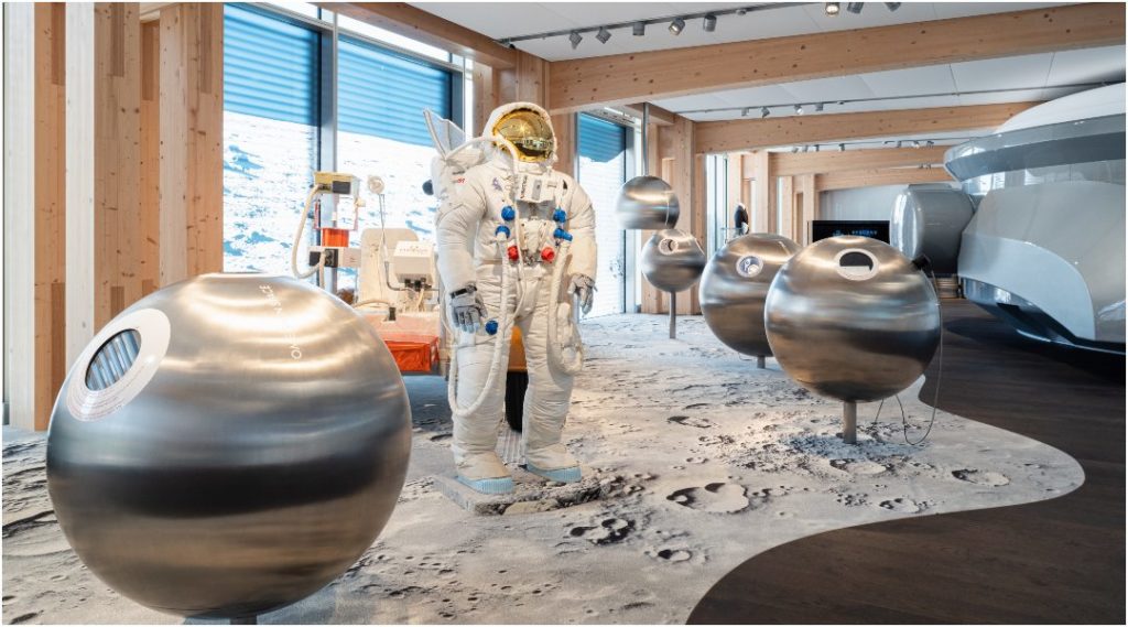 Among OMEGA’s claim to fame is how it is the first watch worn on the moon. The museum features an expansive lunar surface with a Lunar Rover and a life-sized astronaut figure. Massive, silver planet-shaped structures bear specific details of OMEGA’s space story. Its main highlight is the creation of the Speedmaster, the only watch worn by Neil Armstrong and Buzz Aldrin when they first stepped on the moon.