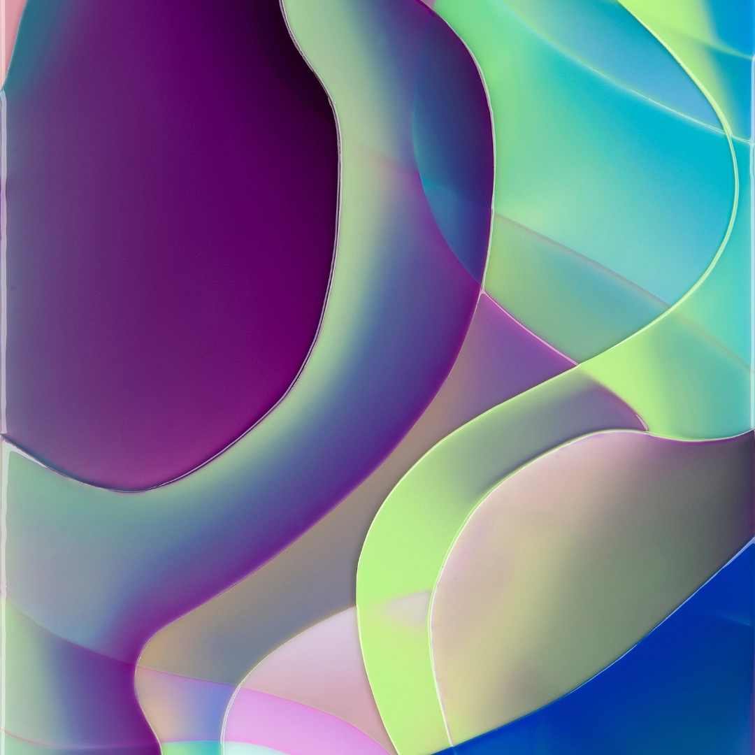 Working with oil or epoxy, the artist produces sleek, large-scale images composed of multiple interwoven layers of color and form. His works are distinguished by seamlessly blended gradients rendered on dibond panels that convey depth, clarity, and a liquid luminosity.