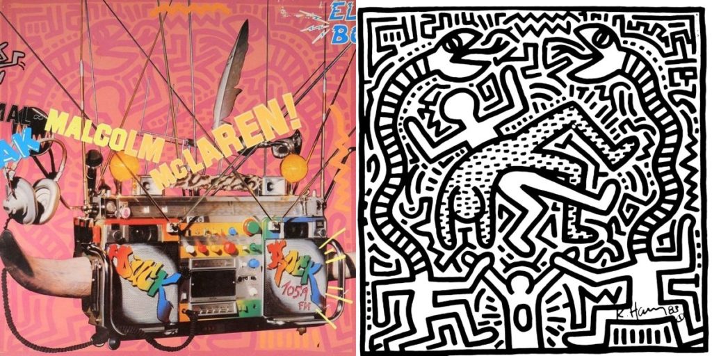 Another artist who designed striking and iconic album covers is Keith Haring (1958-1990), a former subway graffiti artist whose bold, spirited style can now be seen in major private and public collections including the Museum of Modern Art (MoMA), Los Angeles County Museum of Art (LACMA) and the Stedelijk Museum in Amsterdam, to name a few. Haring first received public attention in the early 1980s for the eye-catching illustrations he painted in New York’s subways. He soon started exhibiting in smaller clubs and galleries before exploding into the art scene in 1982 with his inclusion in two international festivals and his first major show in the Tony Shafrazi Gallery. Haring’s whimsical, cartoon-like imagery—chalk outlines of human figures, dogs, and hearts—soon began appearing in everyday items like clothing, watches, postcards, even toys. Because of Haring’s connection to New York street culture and the art world, he was commissioned to design album covers for recording artists like David Bowie, Sylvester, and several hip-hop acts. In 1983, Malcolm McLaren, the English impresario/musician/performer who gained notoriety as the man behind the Sex Pistols punk band, tapped Haring to create an illustration for his debut album Duck Rock. Originally rendered in black and white, Haring’s artwork features his signature thick outline of genderless figures and playful lines and squiggles. Like Haring’s illustration with its nod to Pop Art and street culture, Duck Rock is a collage of styles and influences. The album features hip hop, rap, sampling technology, and world music all coming together in tracks like Buffalo Gals, Double Dutch, and Soweto. Sadly, Haring passed away in 1990 due to AIDS-related complications.