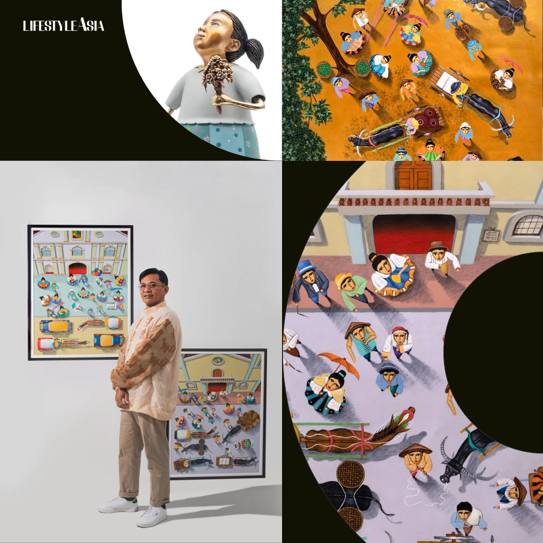 As a viewer, you sense there was once movement in these works, but what you really see is a wondrous aftermath: a suspended state where people stop in their tracks, look up, and gaze at the ineffable. “They’re busy, but they’re surprised to find someone looking at them [from above],” he tells Lifestyle Asia. [Busy lang sila, pero nagulat sila na mayroon tumitingin sa kanila.]
