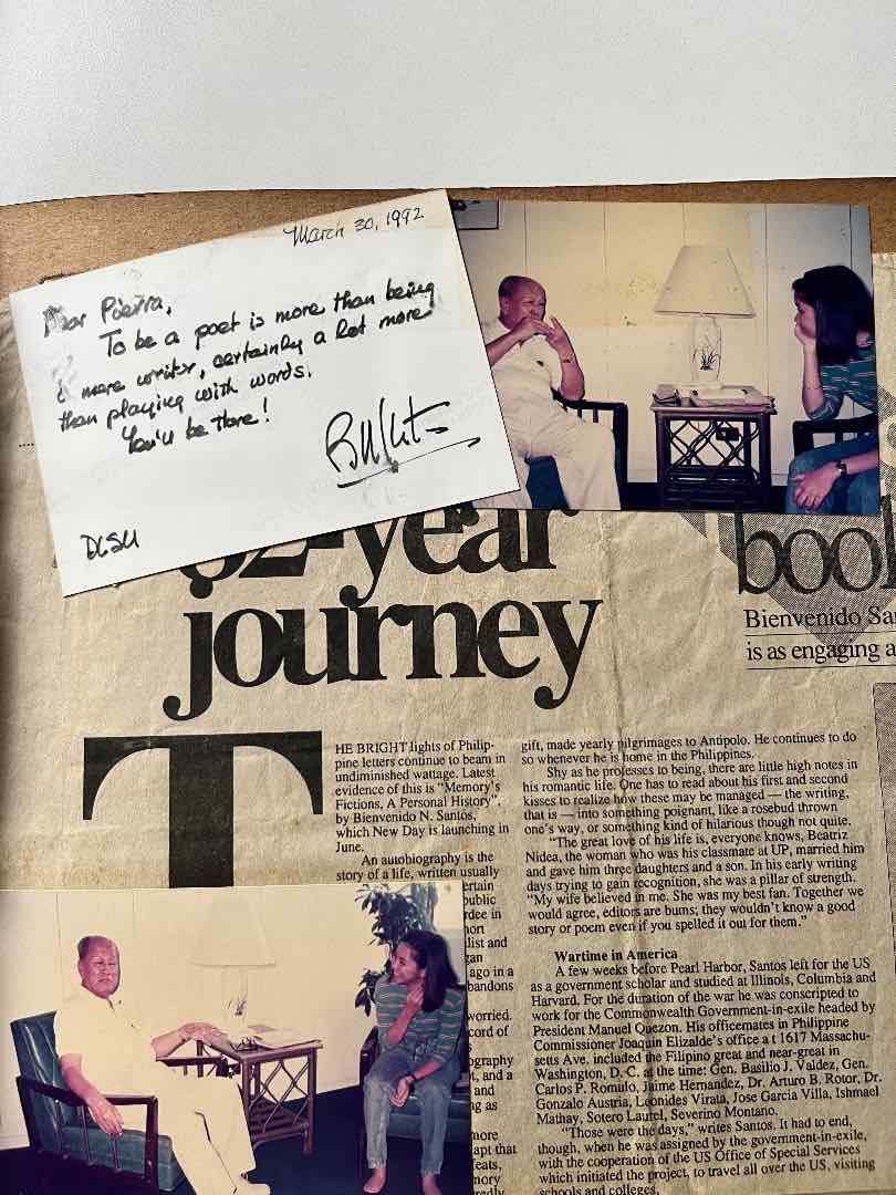 Around this time, for another class, I submitted a poem in place of an essay, and braced myself for the inevitable reprimand from my teacher Brother Gene. Instead, he introduced me to Filipino poet and novelist Bienvenido Santos, who had been based in the US for many years and was considered a pioneering Asian- American writer. Now retired, Santos happened to be a Visiting Artist and Writer at De La Salle University (they would later establish and name their writing center after him).