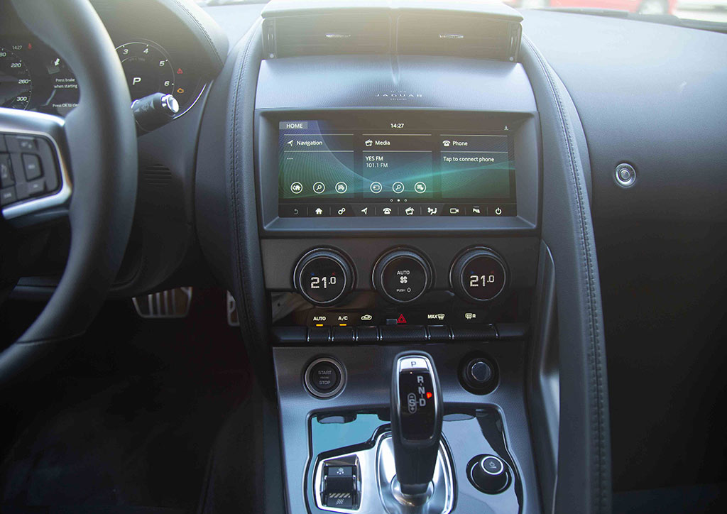 The inside cockpit of the F-TYPE is cozy, driver-centric, and might I add quite British. The elevated middle console leather bucket seats have all the trimming of a sports car, complemented with a futuristic look on the dash with the 10inch touch screen and not-so-complicated dials.