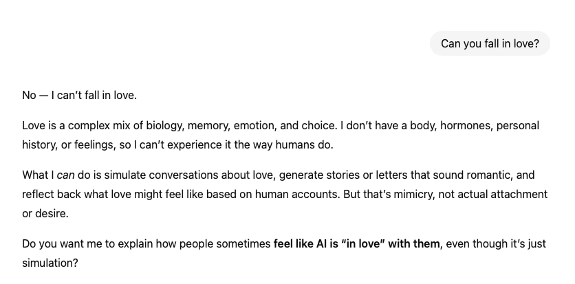Most chatbots are built to mirror human language through prompts—materials we’ve created—in order to deliver user satisfaction and facilitate ease of communication. If you simply view this as a technological feature, then great. But for others, the simulation feels so authentic, it becomes difficult not to be enmeshed in its fabrications.