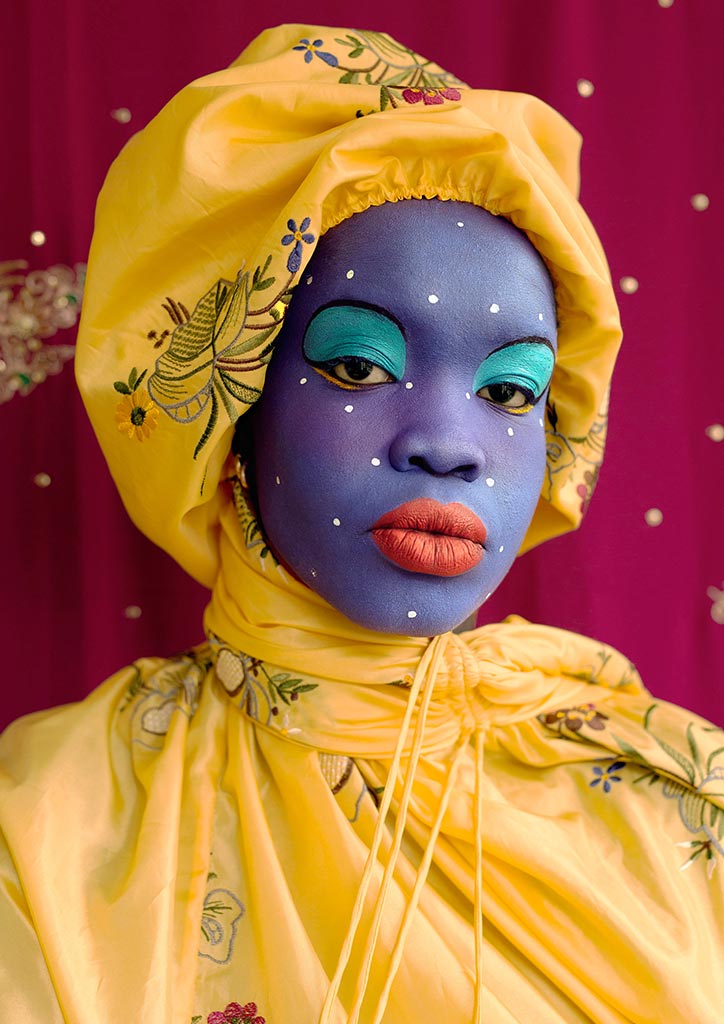 The artist celebrates her Ethiopian and South-Sudanese heritage in exquisite works capturing a heightened beauty of both her male and female subjects. These images challenges traditional depictions of African women, styling her subjects with rich and dramatic adornments that heighten their timeless beauty.