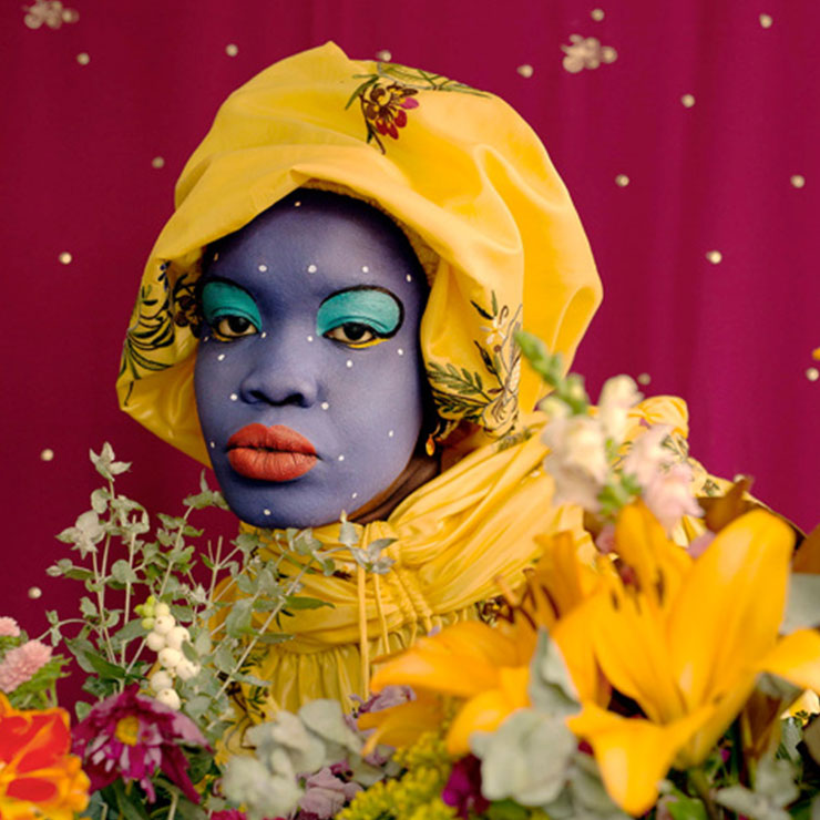 The artist celebrates her Ethiopian and South-Sudanese heritage in exquisite works capturing a heightened beauty of both her male and female subjects. These images challenges traditional depictions of African women, styling her subjects with rich and dramatic adornments that heighten their timeless beauty.