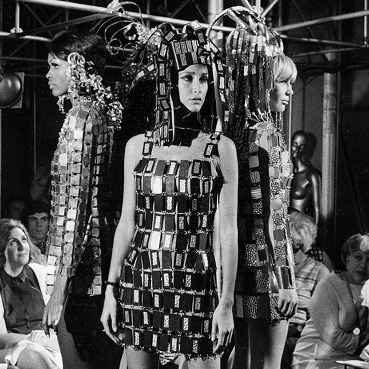 He would later on design jewelry for Balenciaga, Givenchy, and Dion, serving as his way into high fashion. After his successful 1966 show, he would soon dress some of the most high-profile stylish women of the day, including Jane Birkin and Jane Fonda. (The latter would also wear a Paco Rabanne design for her cult favorite film Barbarella.)