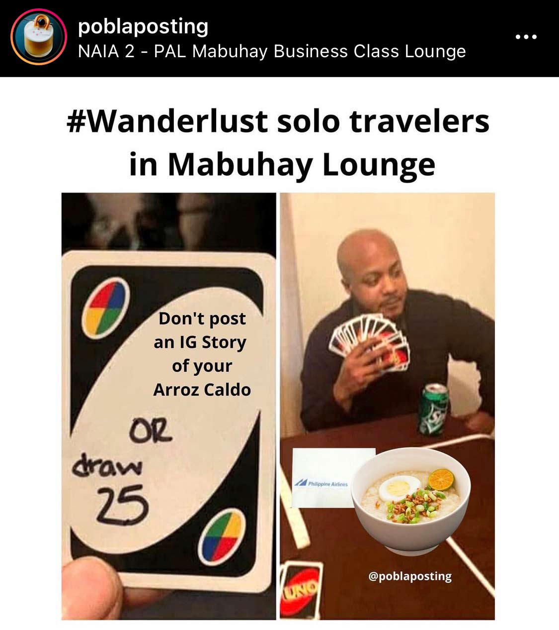 Rather than posting your first-class ticket and your Goyard passport holder, you’re showing off your relatable bowl of arroz caldo. Except it isn’t very relatable because you’re having it in a lounge that is an exclusive perk of the expensive flight you’re about to take. Wink wink, nod nod, I’m rich but I’m just like you because we like the same food but we are obviously not having it at the same place.