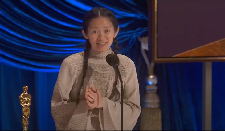 “This is for everyone who had the faith and courage to hold on to the goodness in themselves,” the director, who also won Best Picture as a producer of Nomadland, says from the stage.