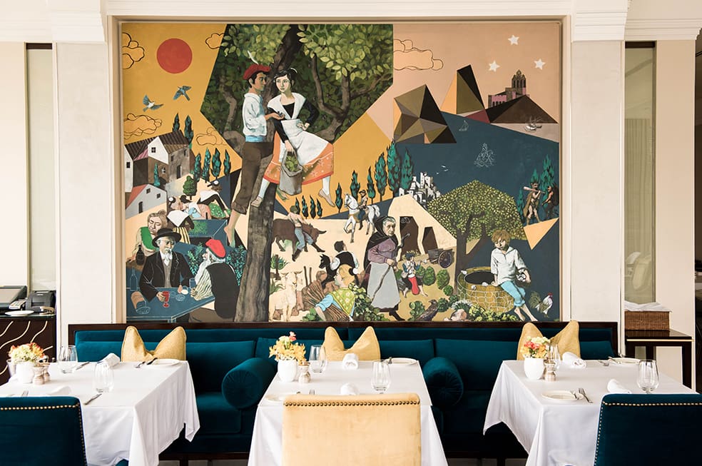 Hanging on the walls of Raffles Makati’s newest upscale brasserie are murals depicting a tragic love story set in France’s countryside region of Provence. The commissioned artworks are inspired by a poem written by Provence’s “favorite son” and Nobel Prize winner Fredric Mistral. It tells the story of Mirèio, the daughter of a rich farmer who falls in love with a poor basket weaver named Vincent. Mirèio journeys from the countryside to the coasts of Saintes-Maries-de-la-Mer to pray to the patron saints for her parents’ approval. However, Mirèio weakens on her journey and dies tragically in Vincent’s arms.