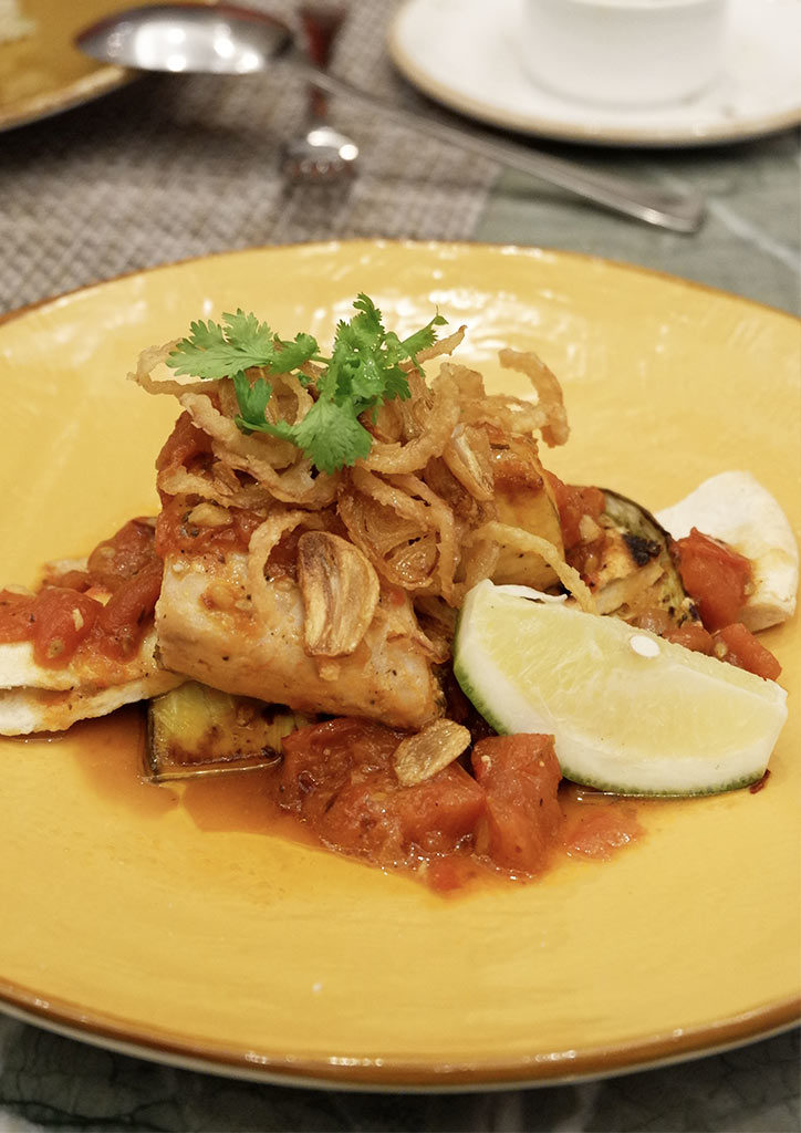 A variety of flavors and textures makes this fillet truly unforgettable. For starters, the snapper absorbs the rich spiced tomato broth well. For every bite, the broth oozes and bursts into your mouth. The fried potato rings add crunch while the slices of pita balance the overall savory taste.