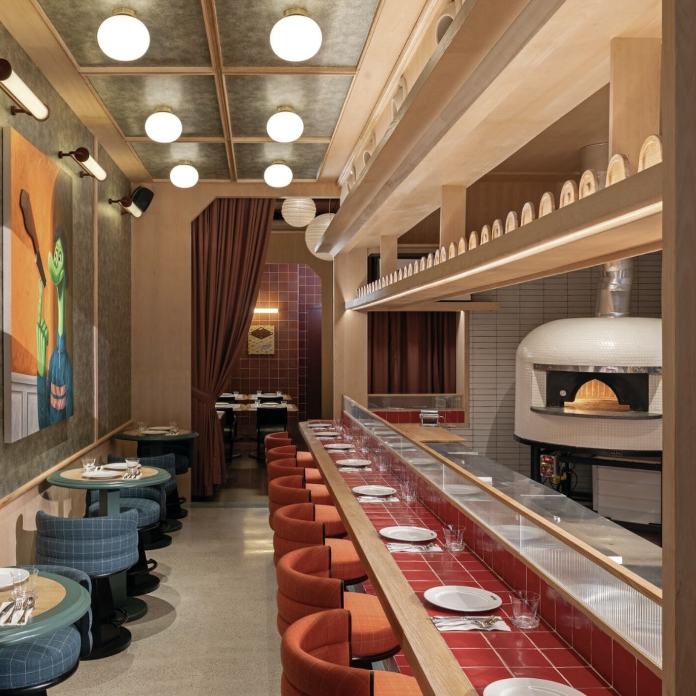 Meanwhile, the central area serves as “Nonna’s Open Kitchen” [a reference to the kitchens of an Italian grandmother, or nonna]. Here, counter-height seating invites  guests to immerse in the culinary magic that unfolds inside the white-tiled pizza oven  imported from Italy. This striking centerpiece represents the heart and soul of the  restaurant’s dining experience. It also contrasts beautifully against poured-in-place terrazzo  flooring and brass trim details in the front-of-house. Counter stools dressed in green tartan fabric surround the culinary spectacle with a “sartorial menswear touch,” as Acuna puts it.