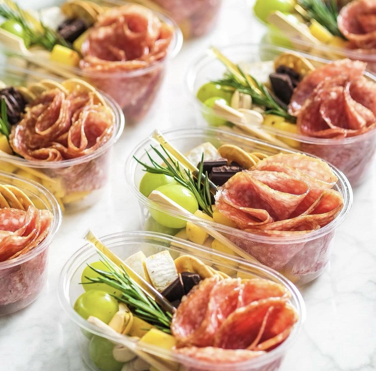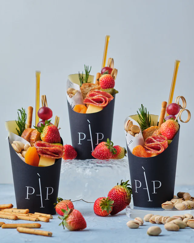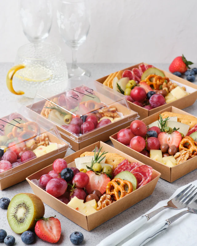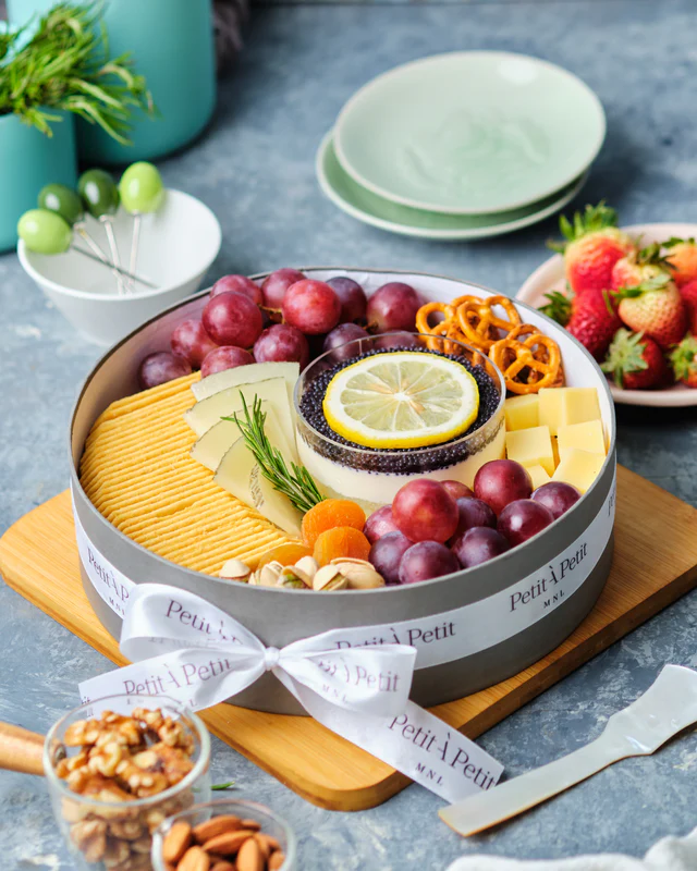 Charcuterie boxes from Petit À Petit are available in various sizes to suit your budget and tastes. Their charming little Charcuterie Cups come in packs of 10—perfect for guests who prefer easy-to-carry treats. A slightly bigger option is their Single-Serve Charcuterie, which has a well-balanced mix of cold cuts, cheeses, fruits, and crackers, all neatly packed into covered boxes.