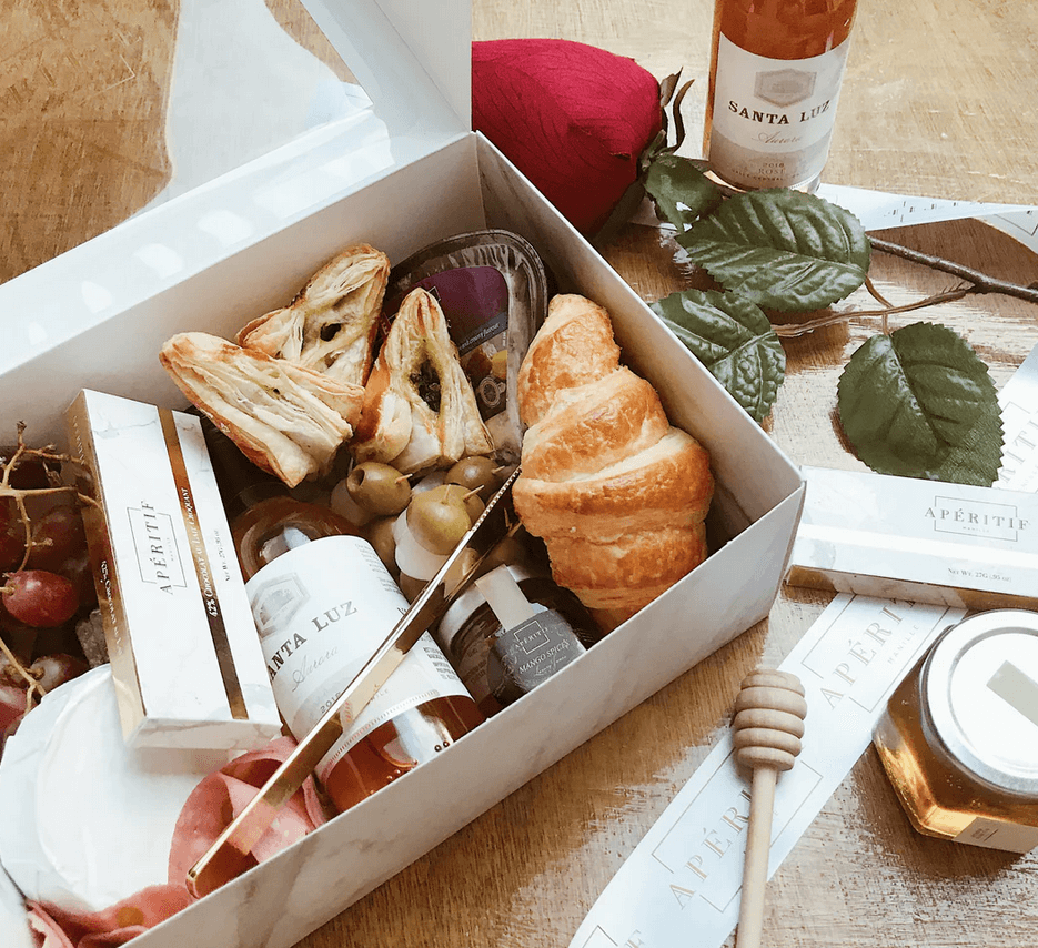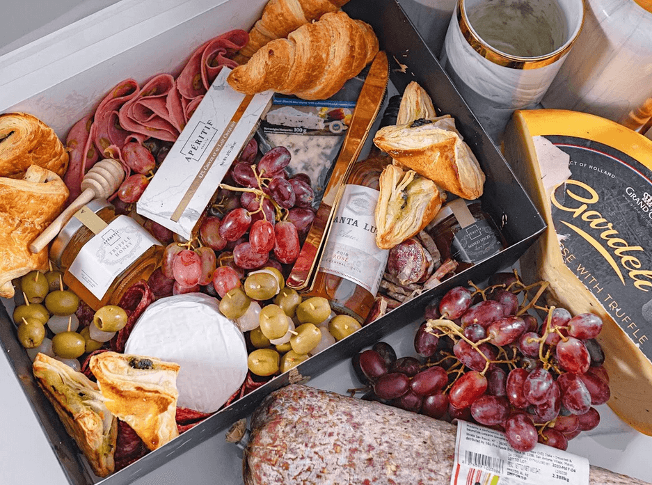 Apéritif PH serves a diverse assortment of grazing and charcuterie boxes available in half, medium, and large sizes, perfect for any occasion, both big and small. The large box comes with treats like croissants, Apéritif’s Ooey Gooey Cookies, chocolates, cheeses (like brie, Danablu, truffle cheese, and gouda), a mini bottle of wine, truffle honey, caperberries, assorted nuts, and premium cold cuts.
