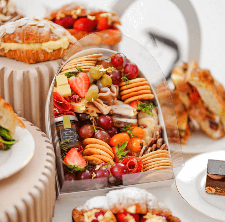 Charcuterie boxes from Petit À Petit are available in various sizes to suit your budget and tastes. Their charming little Charcuterie Cups come in packs of 10—perfect for guests who prefer easy-to-carry treats. A slightly bigger option is their Single-Serve Charcuterie, which has a well-balanced mix of cold cuts, cheeses, fruits, and crackers, all neatly packed into covered boxes.