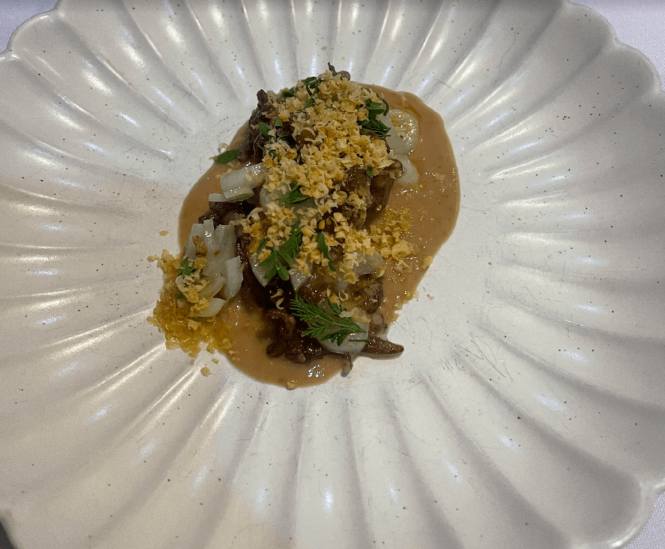 At Linamnam, he often takes a rare grain of the season and cooks it as sunog na kain [burnt rice], with burnt butter and soy sauce that calls to mind the flavors of grilled rice on a sizzling plate, yet also highlights the best qualities of the grain. A rice that’s captivating him at the moment is Camoroso from the Visayas region, which his own aunts help him acquire from farm to kitchen.