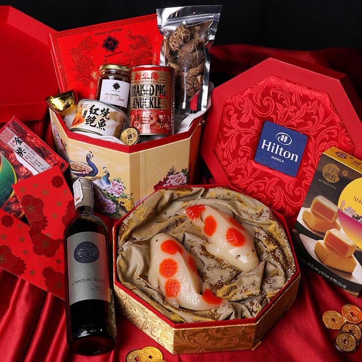 The Premium Prosperity Hamper includes favorites Braised pork knuckles, Braised sliced abalone, Hua Yuan XO sauce, Misua, Pineapple shortcake, Egg rolls, Sunflower seeds, Signature chocolates, dried mushrooms, and a bottle of wine; priced at P6,288. The hotel also offers a Prosperity Hamper at Php 5,888 with the Koi Fish Nian Gao available separately at P1,288.
