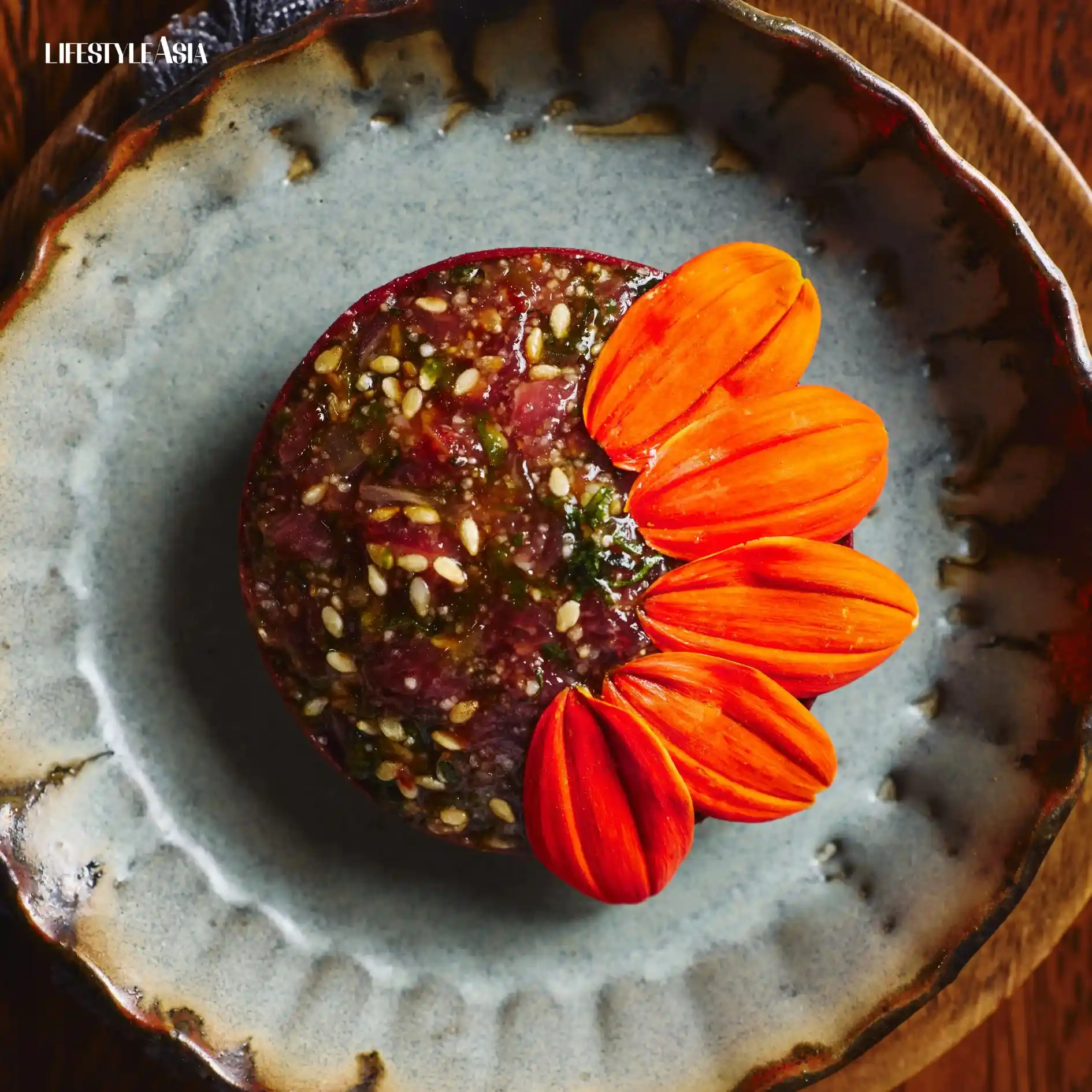 Next is a tartare that’s almost too beautiful to eat. Double gold beef is mixed with herbs and fermented Byadgi chili, set atop a buckwheat-beetroot tart, and finished with bright orange edible flowers. It tastes as stunning as it looks.