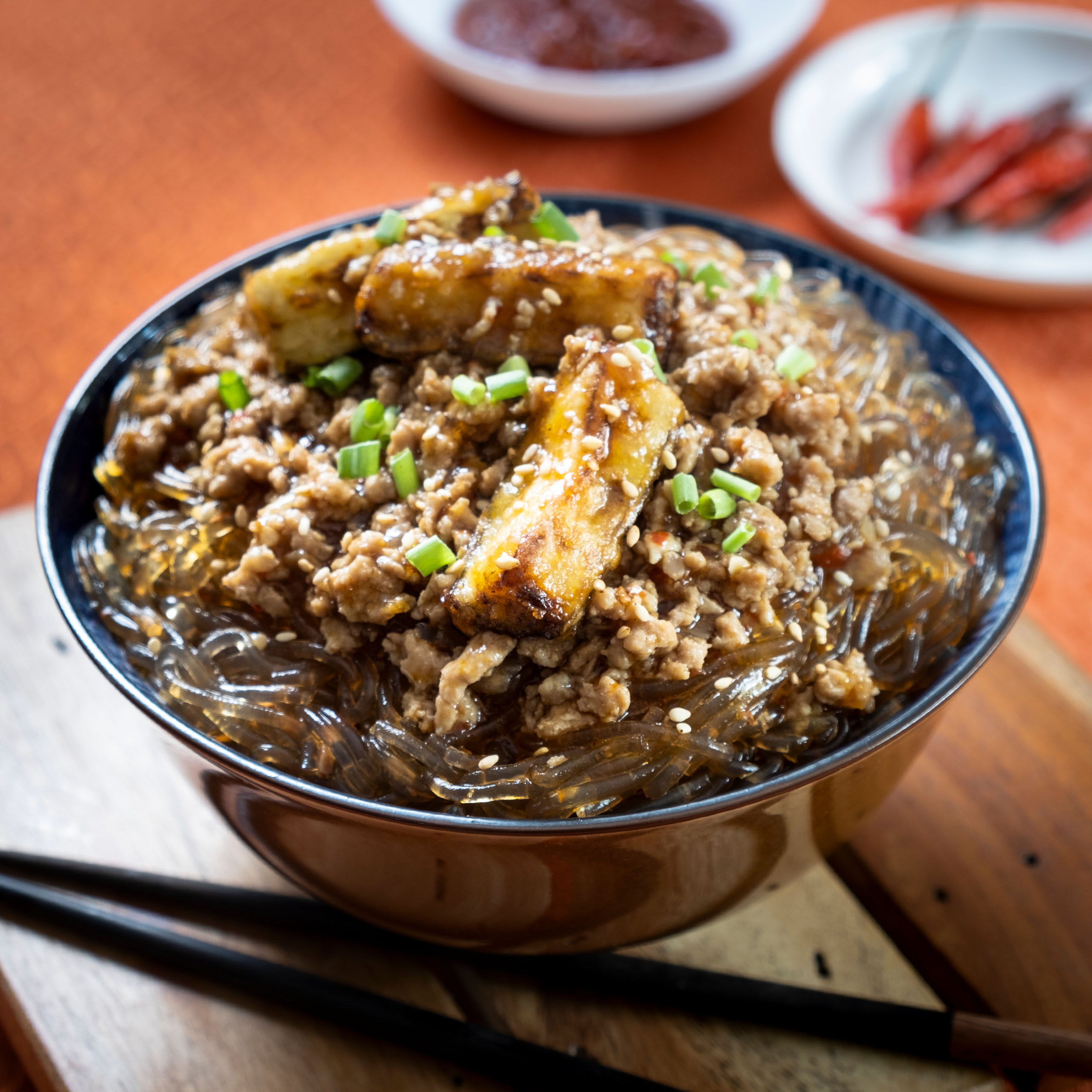 So, she whipped up the sauce base of ginger, chili garlic paste, soy sauce, sugar, and a little vinegar in a bowl, and simmered the liquid mixture with ground pork for a meaty taste. Then, she stirred in a cornstarch slurry to thicken the sauce before tossing in the bouncy noodles to give it an appetizing gloss. “Slippery, chewy, and soft vermicelli topped with the eggplant that has a crispy outer shell and a tender flesh… It’s a nice mouthfeel. Not to mention the fusion of sweet, spicy, and savory all in one sauce,” she describes. “There’s really a balance in texture and in taste.”