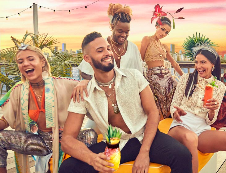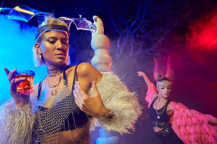 While Dawnridge Estate in Los Angeles was the site of the last Sugarlandia shoot, the Florida stop was at The Standard Hotel. Set against Miami’s sparkling skyline, the shoot that was photographed by Joe Toto, was filled with gleaming scenes of bejeweled mask adorned friends exploring the tropical grounds of the hotel.