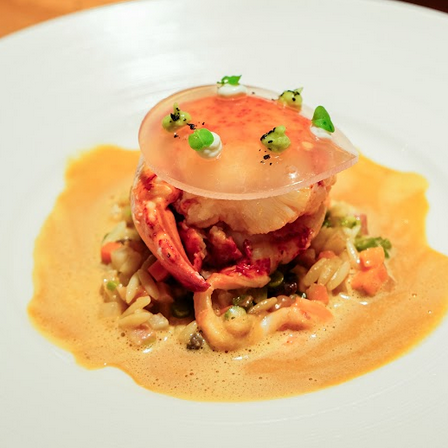 “Acte II” kicked off with Homard, a seafood lover’s dream dish made up of lobster fricassée (a type of ragout made from the shellfish’s white meat), seasonal vegetable matignon (minced vegetables), risoni lobster juice in aspic, and bisque whipped with foie gras.
