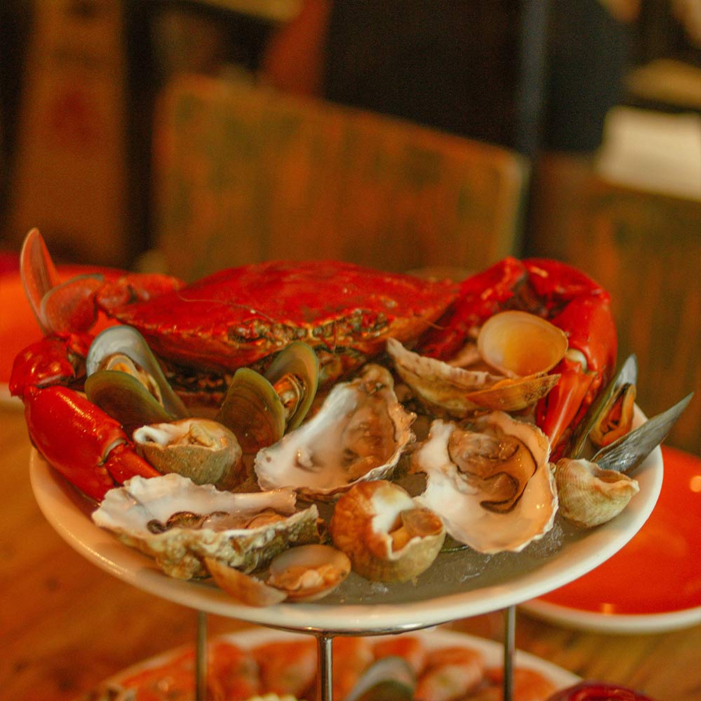 For the upper plate, we have the crowning glory of the platter – a whole crab. Around this ruby centerpiece is a scattering of Fine de Claire oysters as well as some more mussels, clams, and winkles.