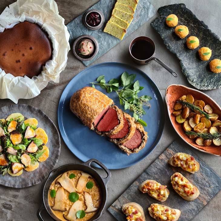 The restaurant’s at-home dining offerings range from prime cuts flown straight from Japan to favored sides such as Gyoza. Classics such as Nori Tempura served with wasabi and caviar, Gyudon, and Yakiniku Don are also on the menu. Heartier and unusual fare include a A5 Kobe Beef Burger Steak Rice and their Chateaubriand Sando.