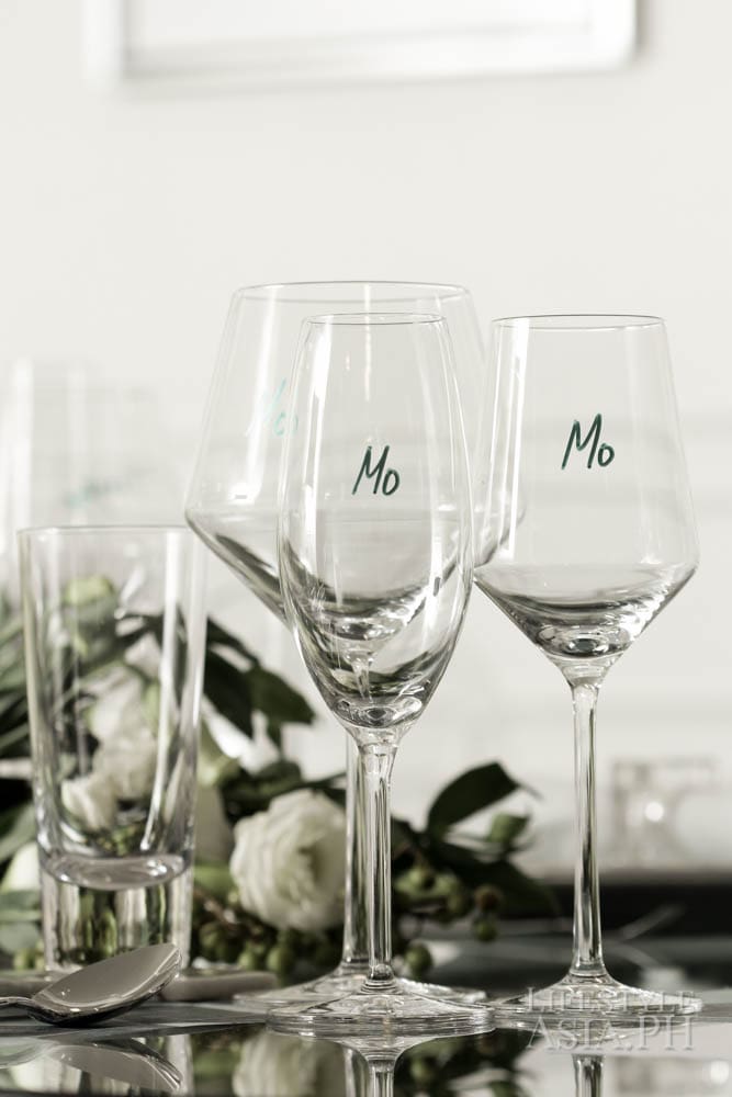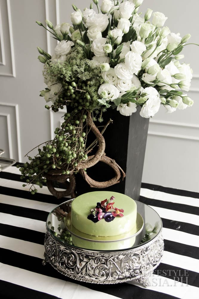 Mannequins and other accouterments hinting at the life of a designer are set aside, early in the mornings, before Maureen’s intimate dinners. “I spent the whole morning setting up the place,” she begins. Bottles of bubbly and fine spirits are chilled a little after midday so that it is ready for consumption come happy hour. “Everything that I put on the table is a labor of love. But I don’t cook!,” she says with candor. “I do have a good list of people to contact when I plan my dinners.” Her sister, Rebecca, is someone she recommends for beautiful desserts and pastries.  “She made this Le Matcha mirror cake especially for my dinner. It is one of her masterpieces. I’m so happy that I can always call her to create beautiful cakes for my dinners,” beams the host.