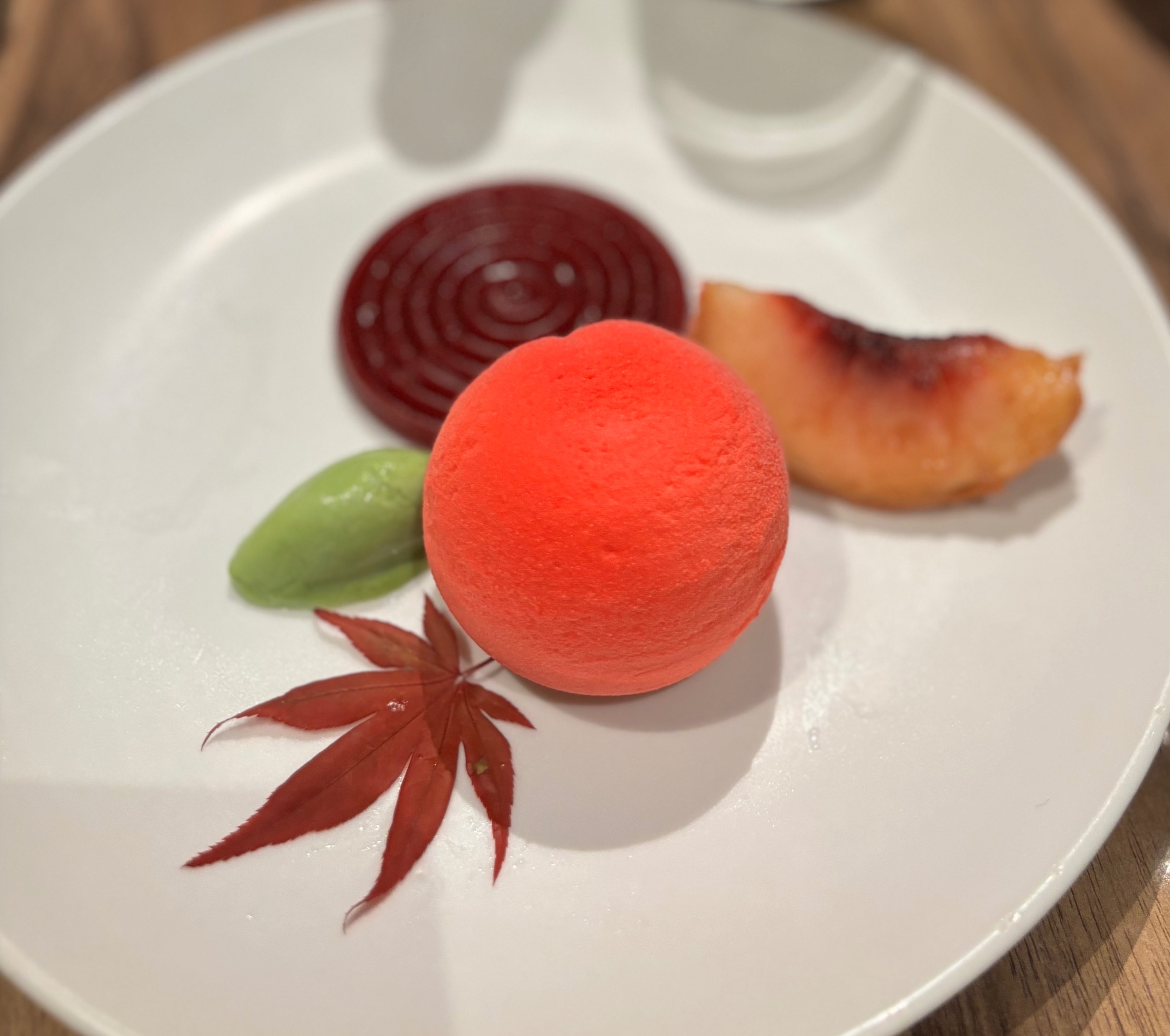 Finally, the Mizugashi featured a Matcha Ice Cream with peach sake sauce, jelly, and toasted flaxseed biscuit. Amusing enough, the lovely dessert mimicked a real peach and was paired with Gekkeikan Horodoke Peach Sake Liqueur. With its low alcohol, it is easy to drink. In addition, the sake is from Kyoto, refreshingly fruity with hints of sweetness from fresh peach juice from Yamaguchi Prefecture. Alcohol By Volume: 3% | Origin: Yamaguchi