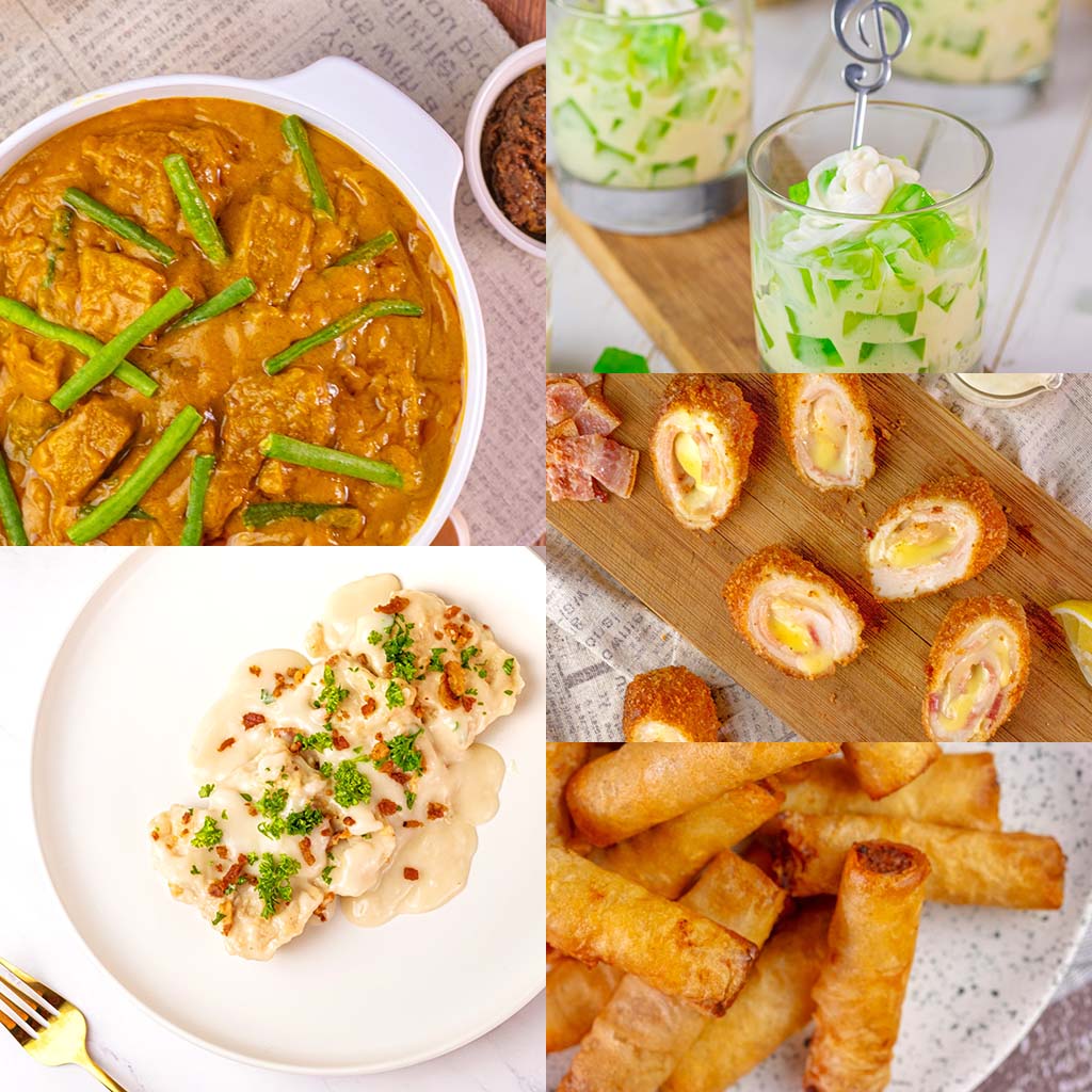 Kare kare, Baked Fish fillet, Buko Pandan, Chicken Cordon Bleu, and Lumpia Shanghai