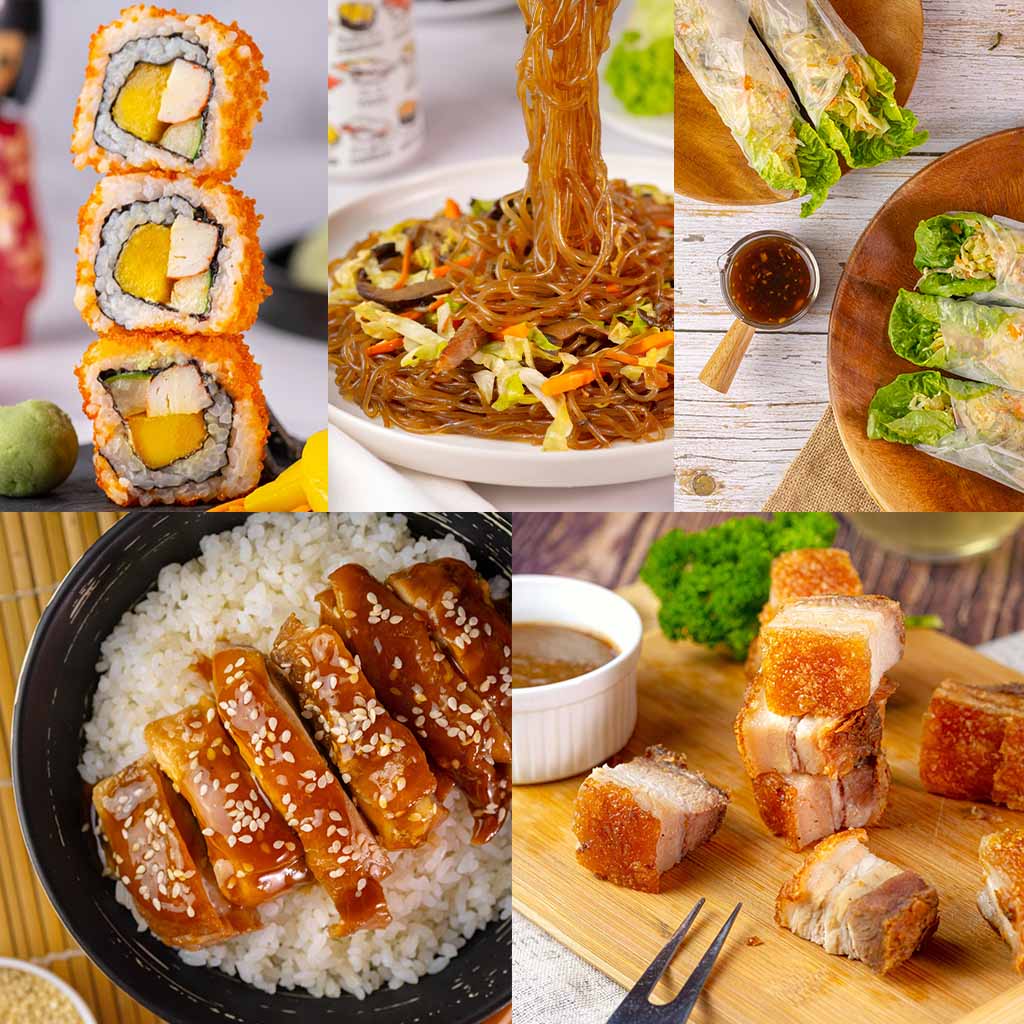 California Maki, Japchae, Fresh Chinese Lumpia, Chicken Teriyaki, and Lechon Kawali
